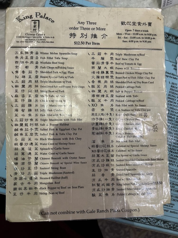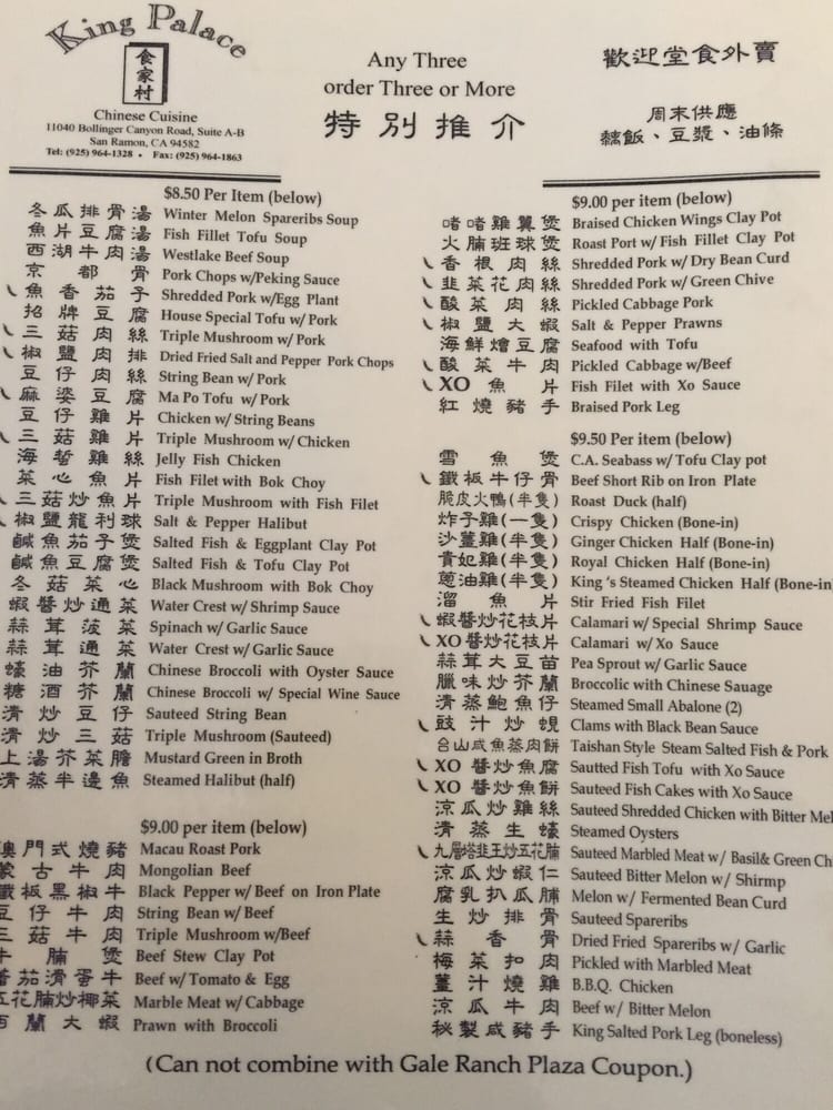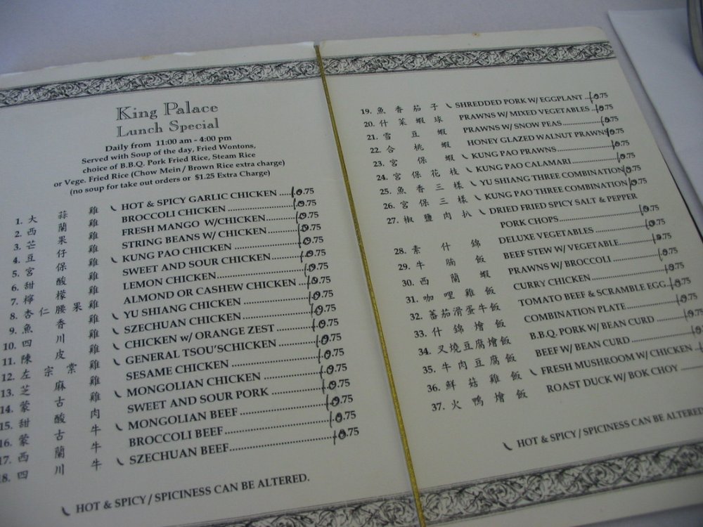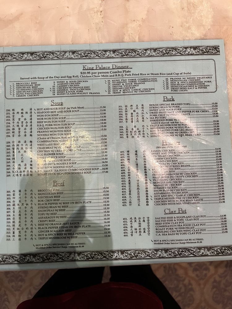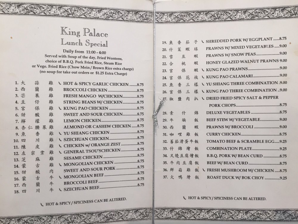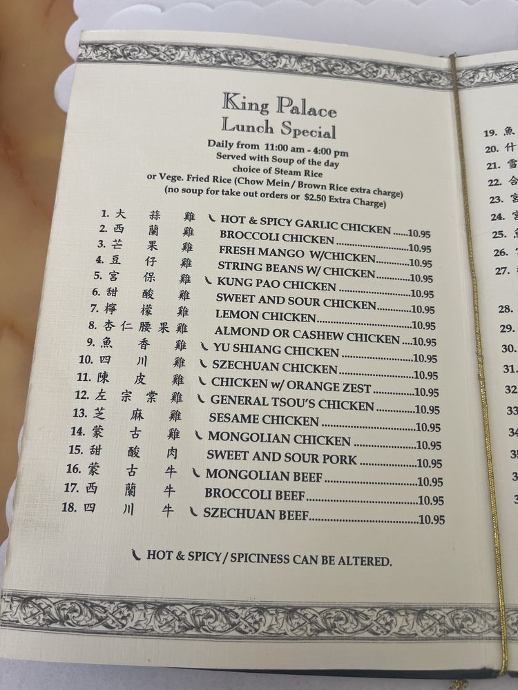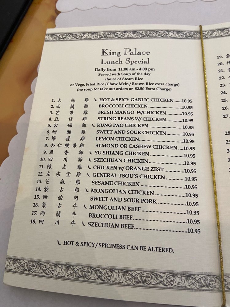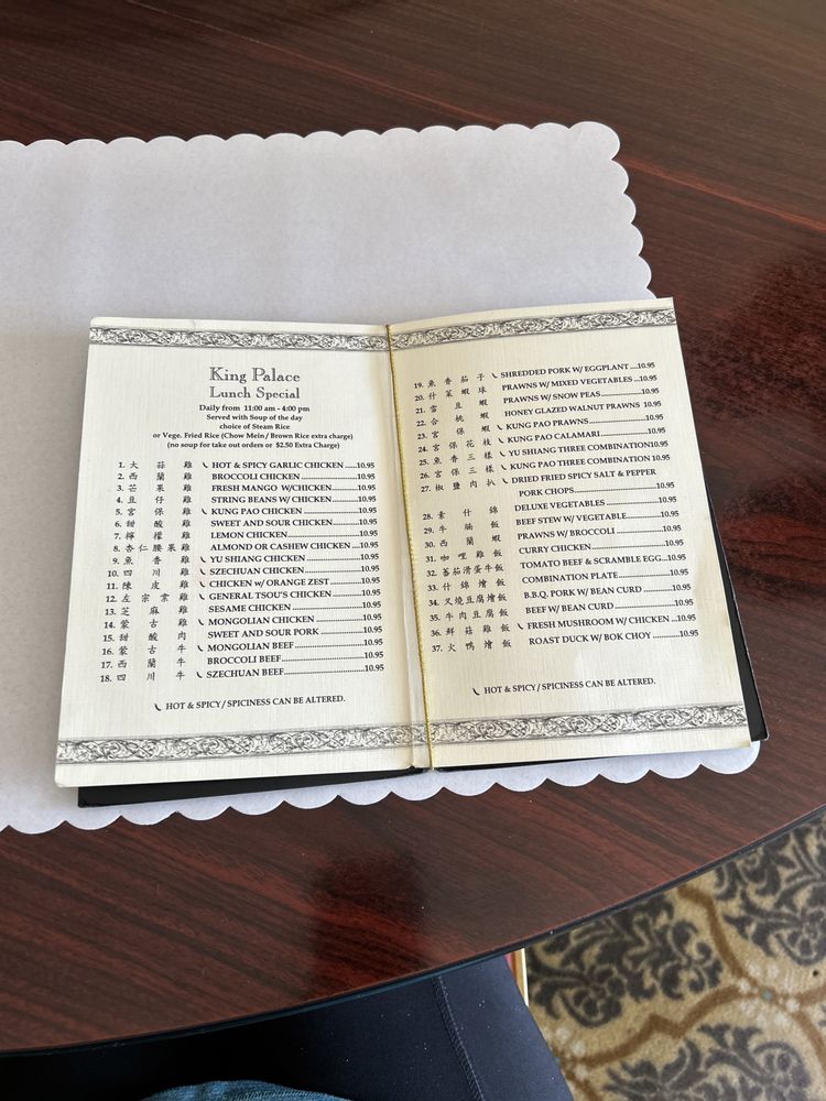 Introducing the menu at King Palace, a Chinese restaurant located in San Ramon, CA. Known for its generous portions and delicious food, customers rave about their authentic dishes, friendly service, and affordable prices. Standout dishes include the steamed chicken, vegetable spring rolls, General Tsao chicken, and hot and sour soup. The restaurant offers a casual atmosphere with options for takeout, delivery, and catering. With many vegetarian options available, King Palace caters to a variety of dietary preferences. The menu features traditional Chinese dishes with a focus on fresh ingredients and flavorful sauces. Overall, King Palace delivers a satisfying dining experience with top-notch quality and reasonable prices.